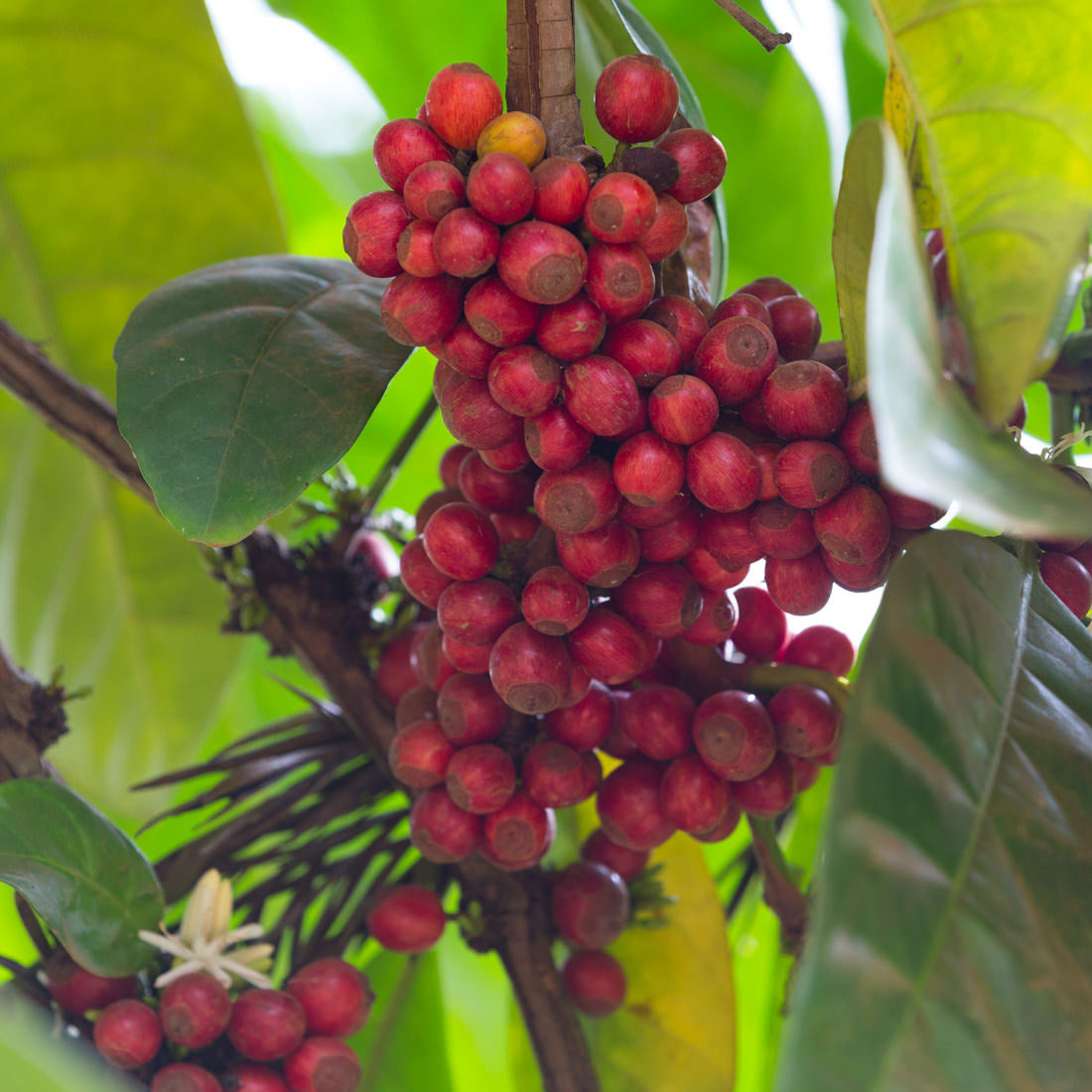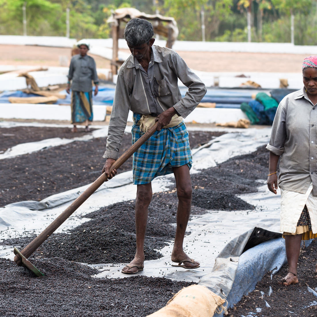 Other products from Badra Estates include pepper, coconut, areca nut and cardamom, which have a wonderful influence on the flavor profile of the coffee due to their allopathic effects. They increase biodiversity, ensure good humus formation and thus make a decisive contribution to eliminating the need for chemical weed and pest control. Jakob Mammen grows both Arabicas and Canephoras (the botanically correct term for the most commonly used term Robusta), namely the varieties: S 795, Catimor, Sarchimor, SLN 9 (Arabica) and SLN 274, Old Paradenia (Canephora). A third species, the Liberica, was rediscovered in recent years, adding an exotic specialty to the portfolio in very small harvest quantities.